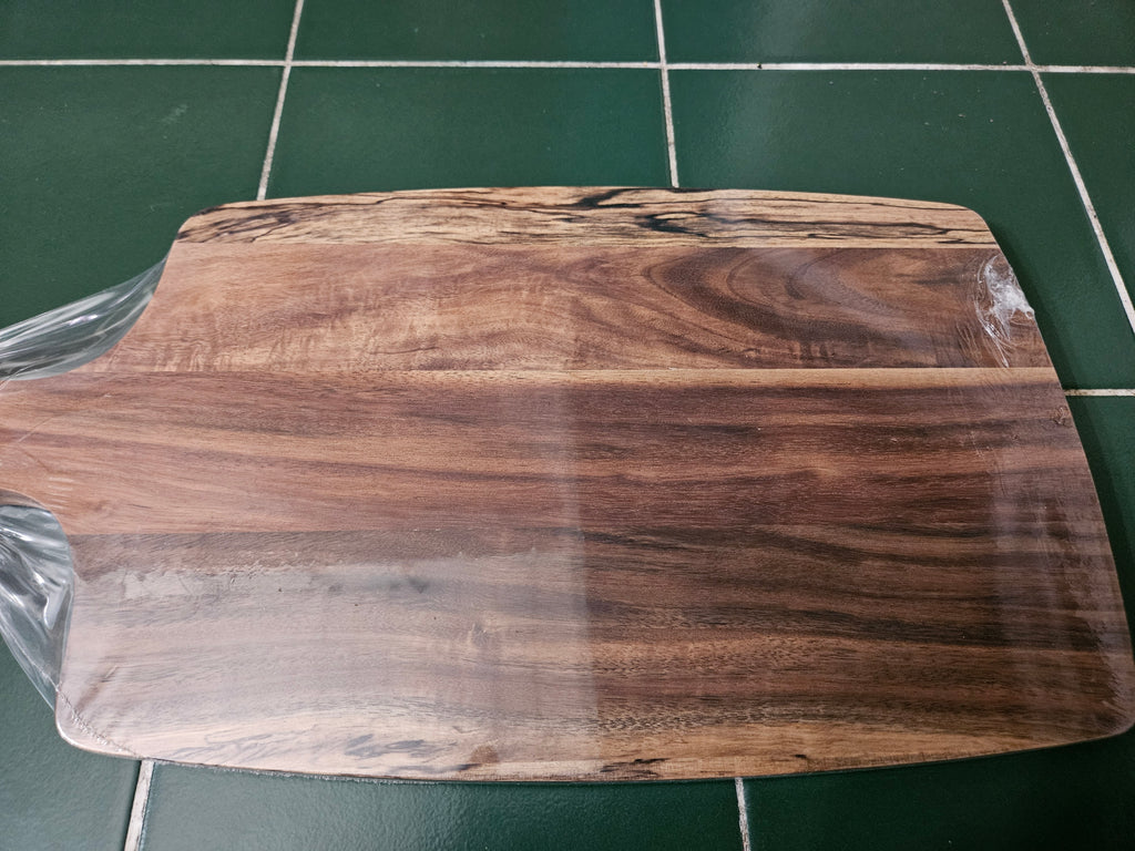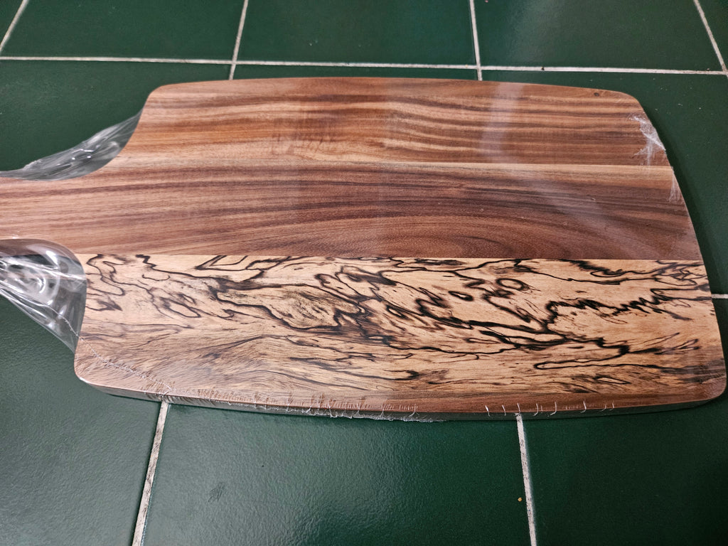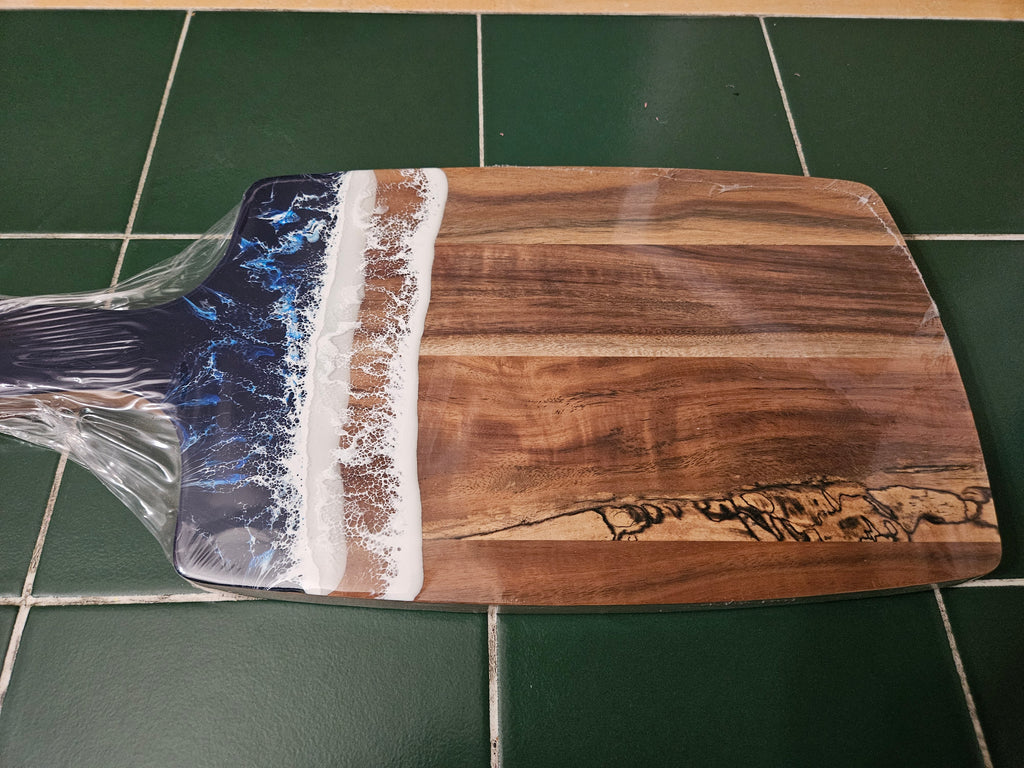 These boards are made from Acacia wood and are approximately 15" x 7.25" x .5". This measurement includes the length of the handle.